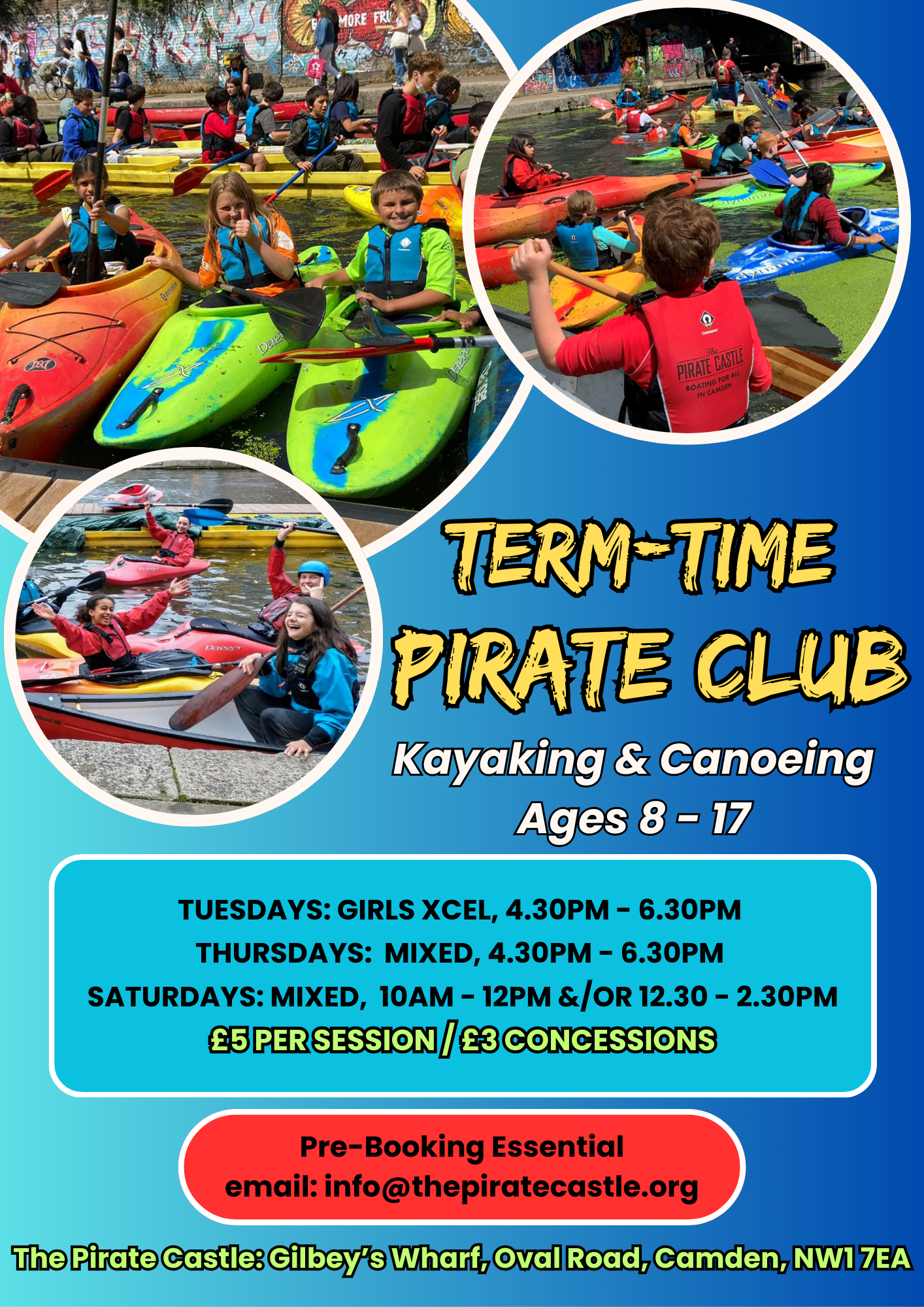 All Pirate Club sessions are progressive and led by our team of British Canoeing coaches and instructors. From absolute beginners to more experienced paddlers, there's no better way for kids aged 8+ to have safe, adventurous fun, let off steam and learn new skills on the Regent's Canal in the heart of Camden Town!